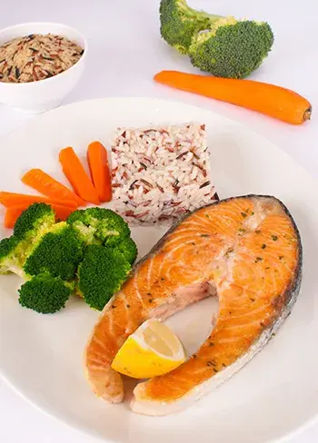 - Grilled salmon with brown rice, roasted broccoli, and carrots
