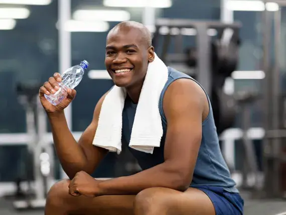Rehydrate. Typically water is sufficient to replenish your body. Sports drinks should only be used after high-intensity or long-lasting exercise. For example, if you are running five miles in high heat, you may want to replenish with a sports drink. However, if you are walking on the treadmill for 45 minutes, water would be sufficient for rehydration.