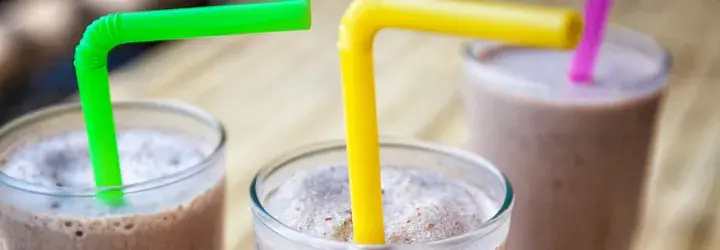 Protein shakes, such as Muscle Milk, are best to consume post-exercise (especially after weight-training activity) as a recovery drink. On average, they contain 20-30 grams of protein, which can help build lean muscle. Typically, protein shakes contain 0-5 grams of sugar. This would be another good option if you are limiting your total caloric intake.