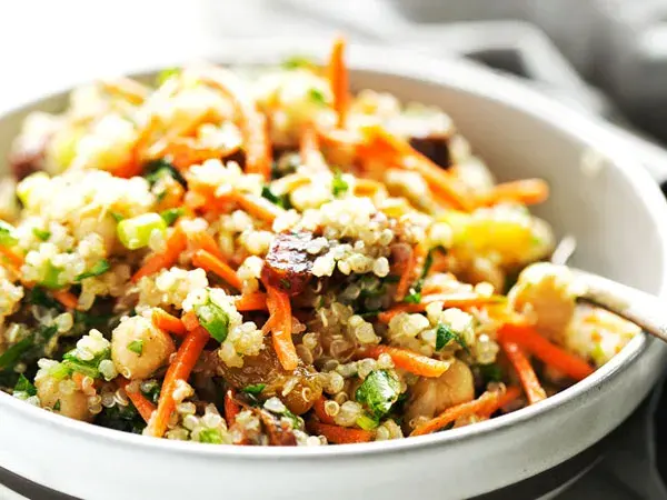 Vegetable power to the max! This recipe is a beautiful mixture of colors, texture, and flavor that proves plant nutrients can keep you satisfied and full. Protein-packed quinoa and chickpeas, combined with crunchy carrots, sweet raisins and dates, nutty pistachios, and an easy homemade, Moroccan style dressing make this the perfect meal package.